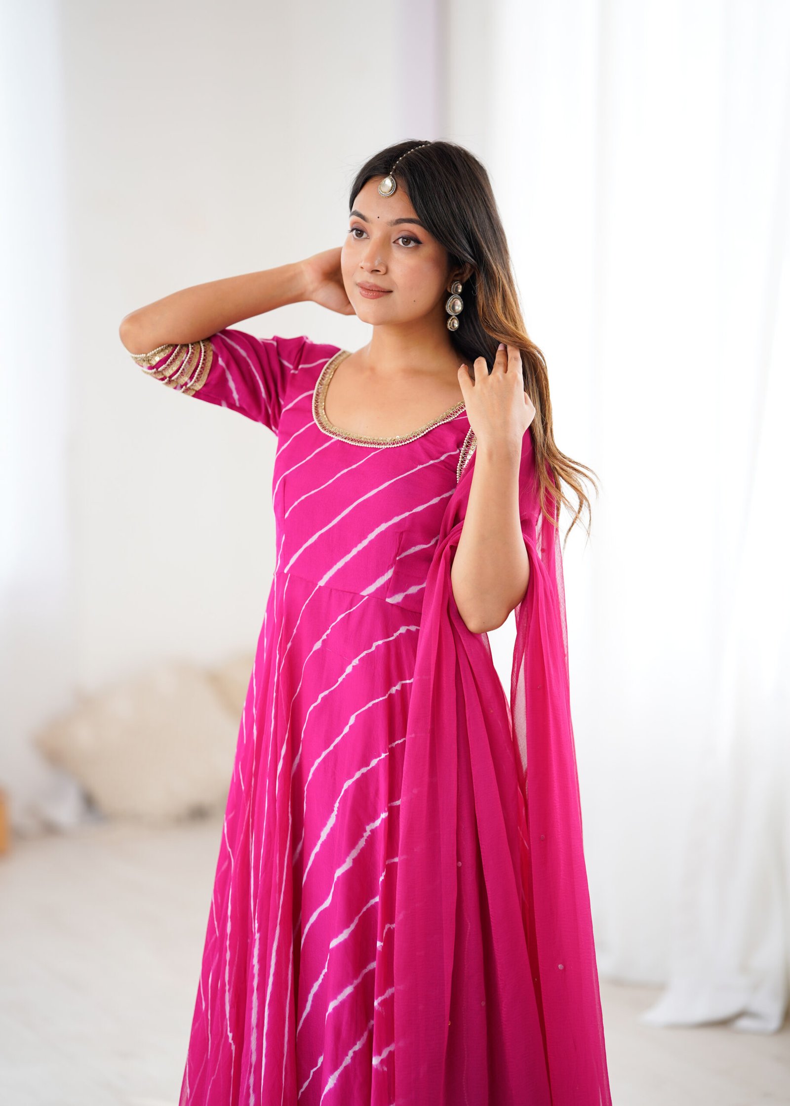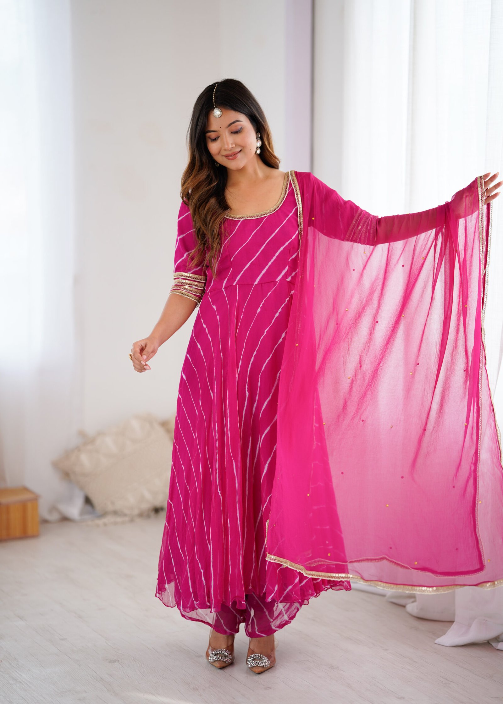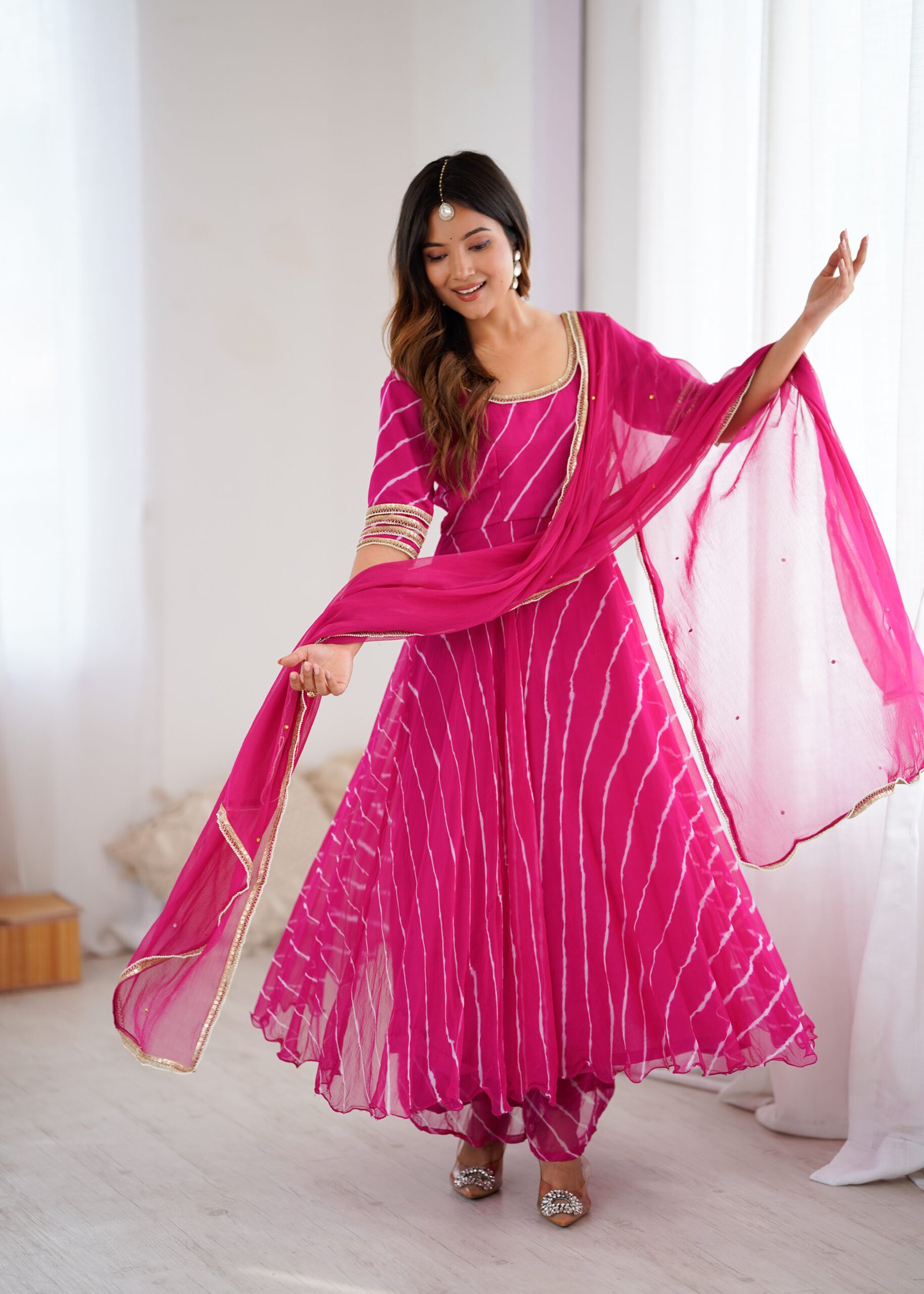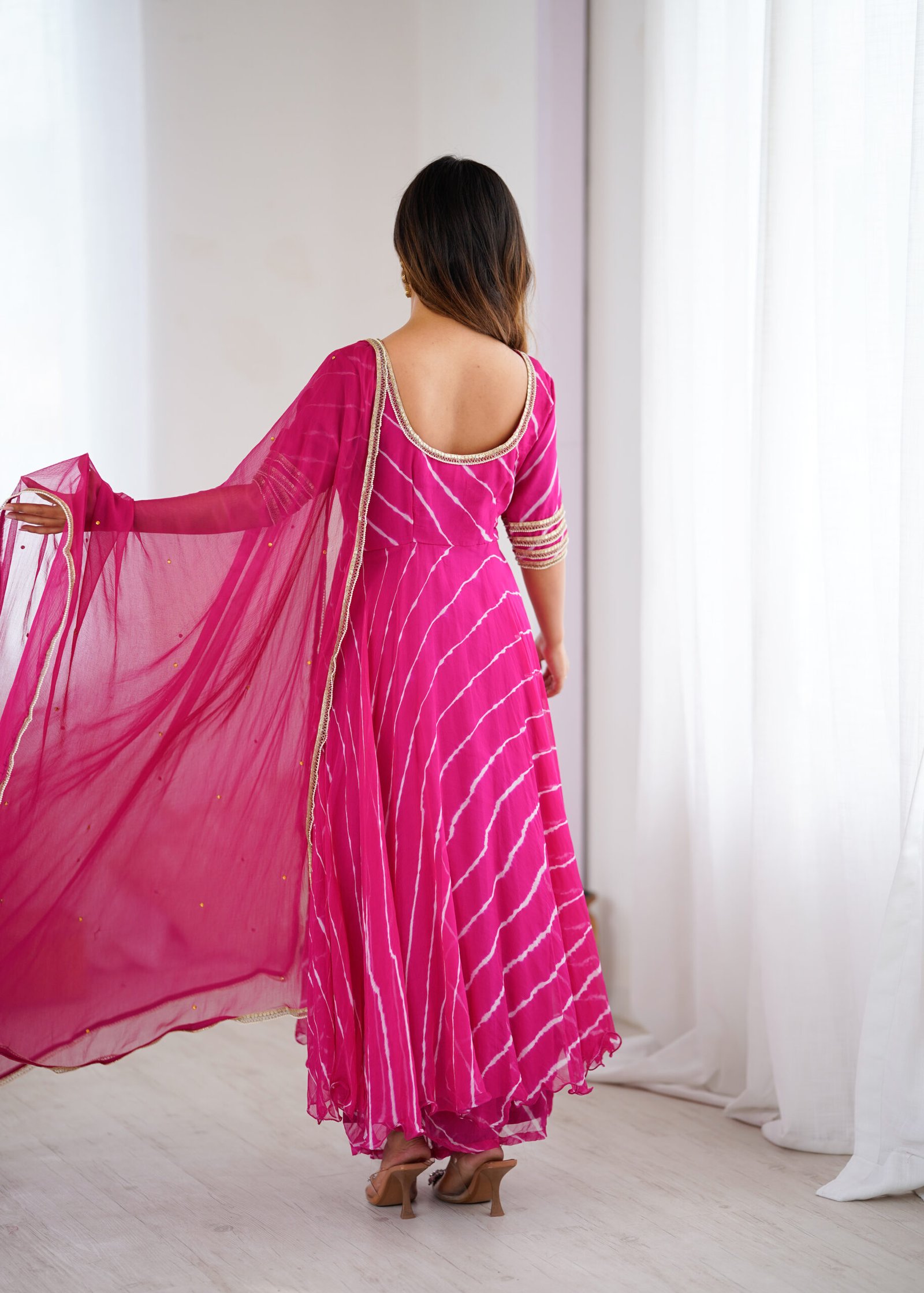Step into effortless elegance with our Noor Leheriya Chiffon Anarkali Palazzo Set, beautifully crafted in lightweight chiffon fabric for a soft, flowy drape. The anarkali features delicate leheriya-inspired stripes and a graceful flare, paired with a matching chiffon palazzo for a coordinated and contemporary ethnic look.