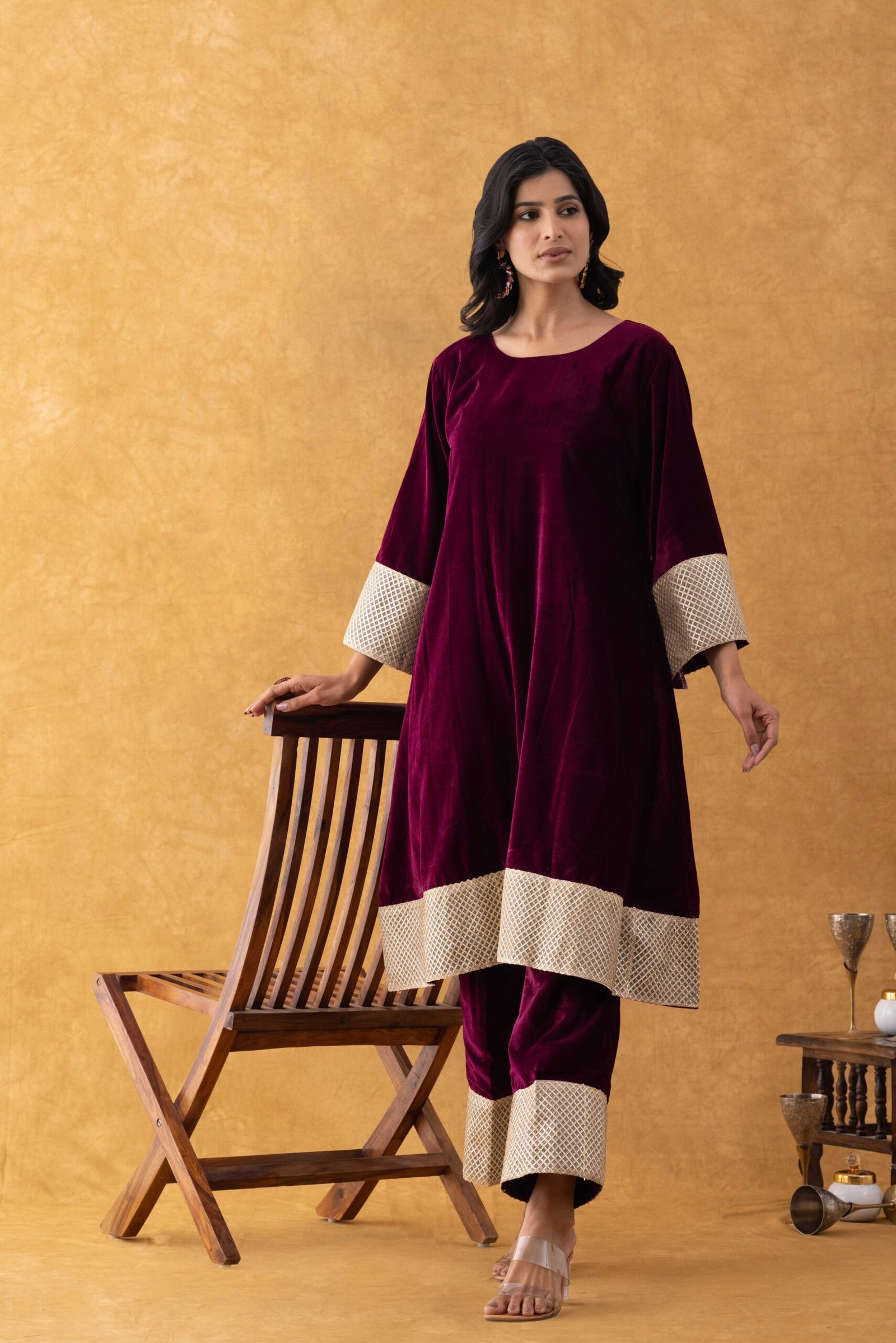 Be the first to review “RANGPUR Burgundy Velvet Kurta Pant Set with Gold Borders”