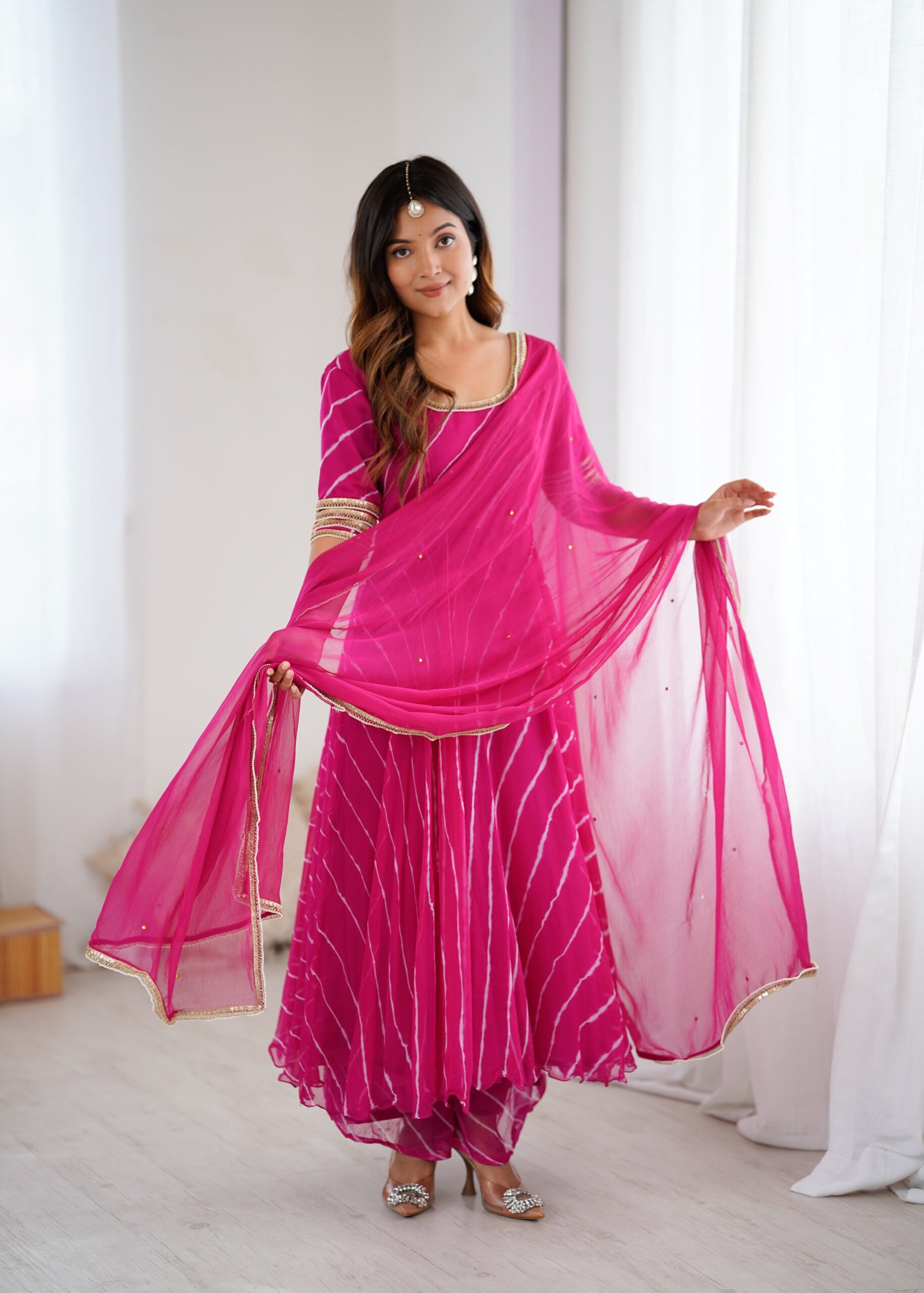 Step into effortless elegance with our Noor Leheriya Chiffon Anarkali Palazzo Set, beautifully crafted in lightweight chiffon fabric for a soft, flowy drape. The anarkali features delicate leheriya-inspired stripes and a graceful flare, paired with a matching chiffon palazzo for a coordinated and contemporary ethnic look.