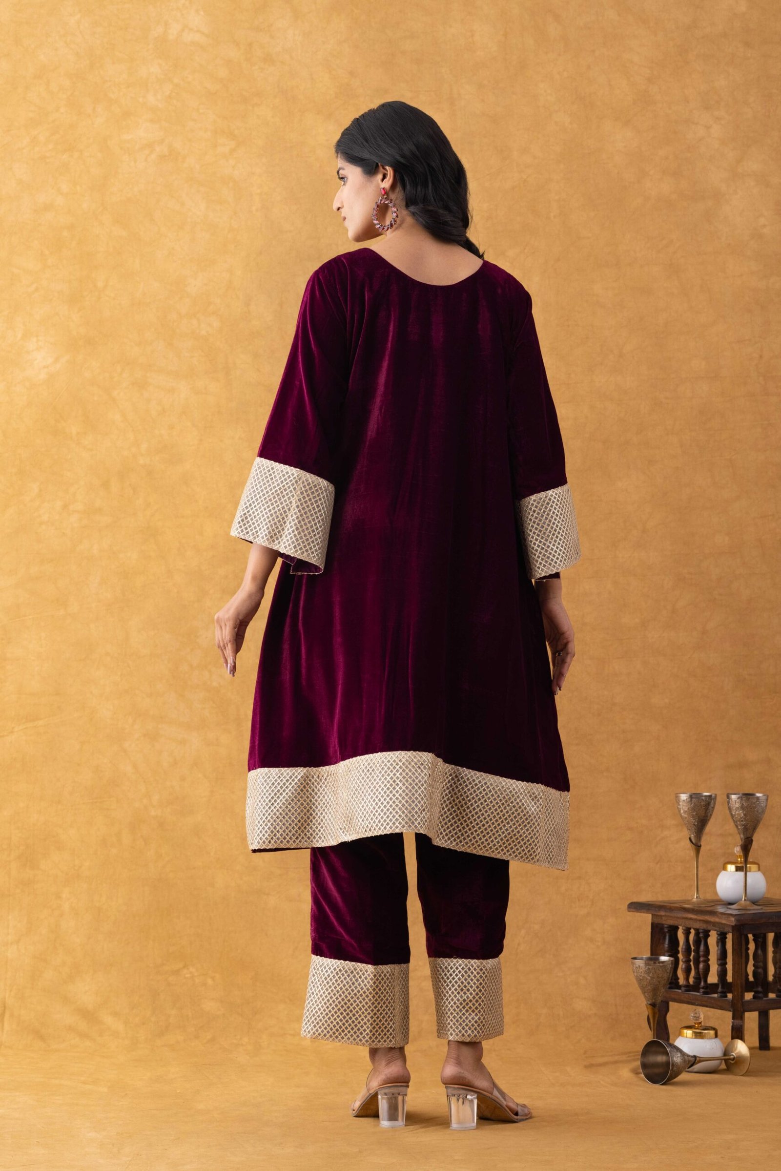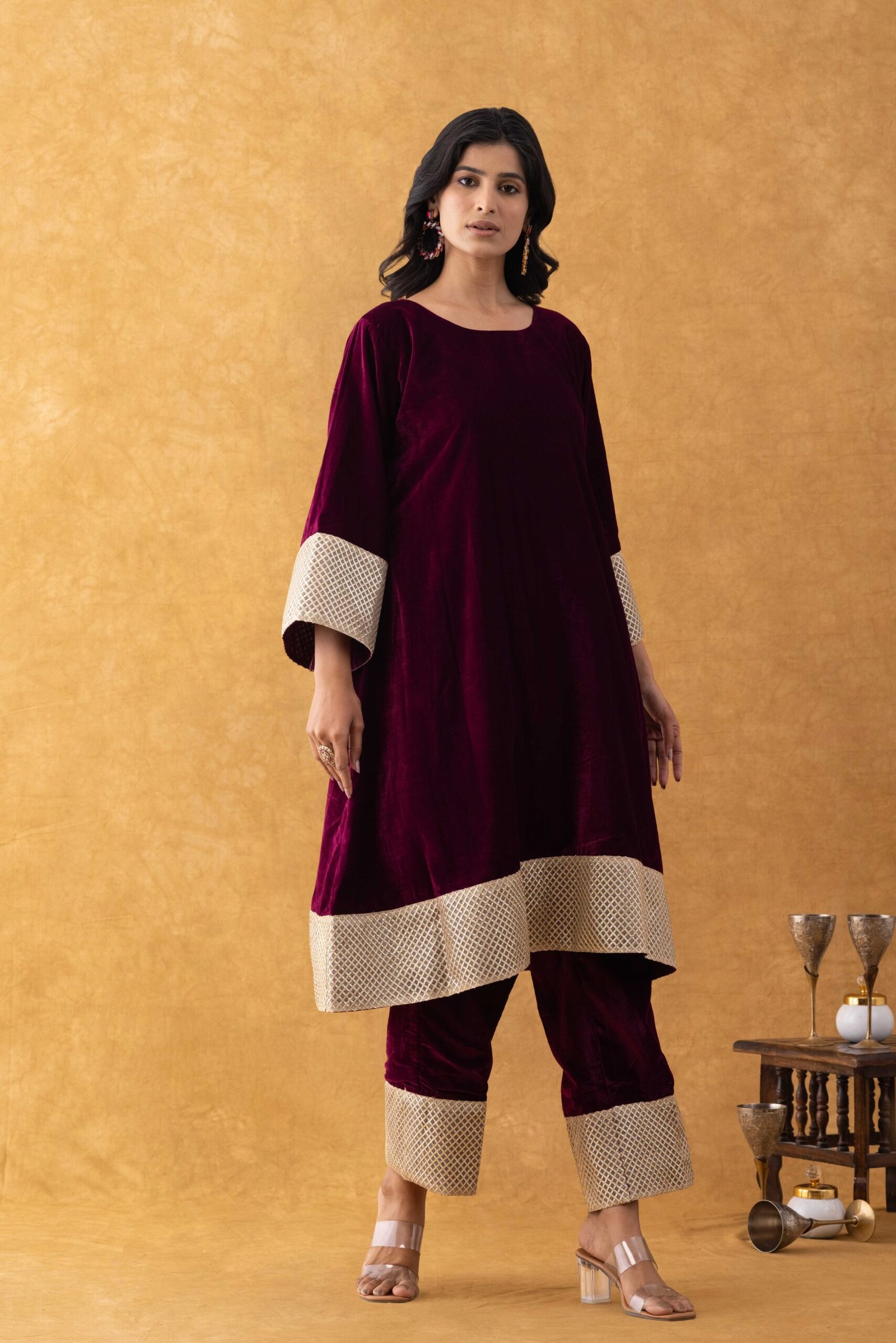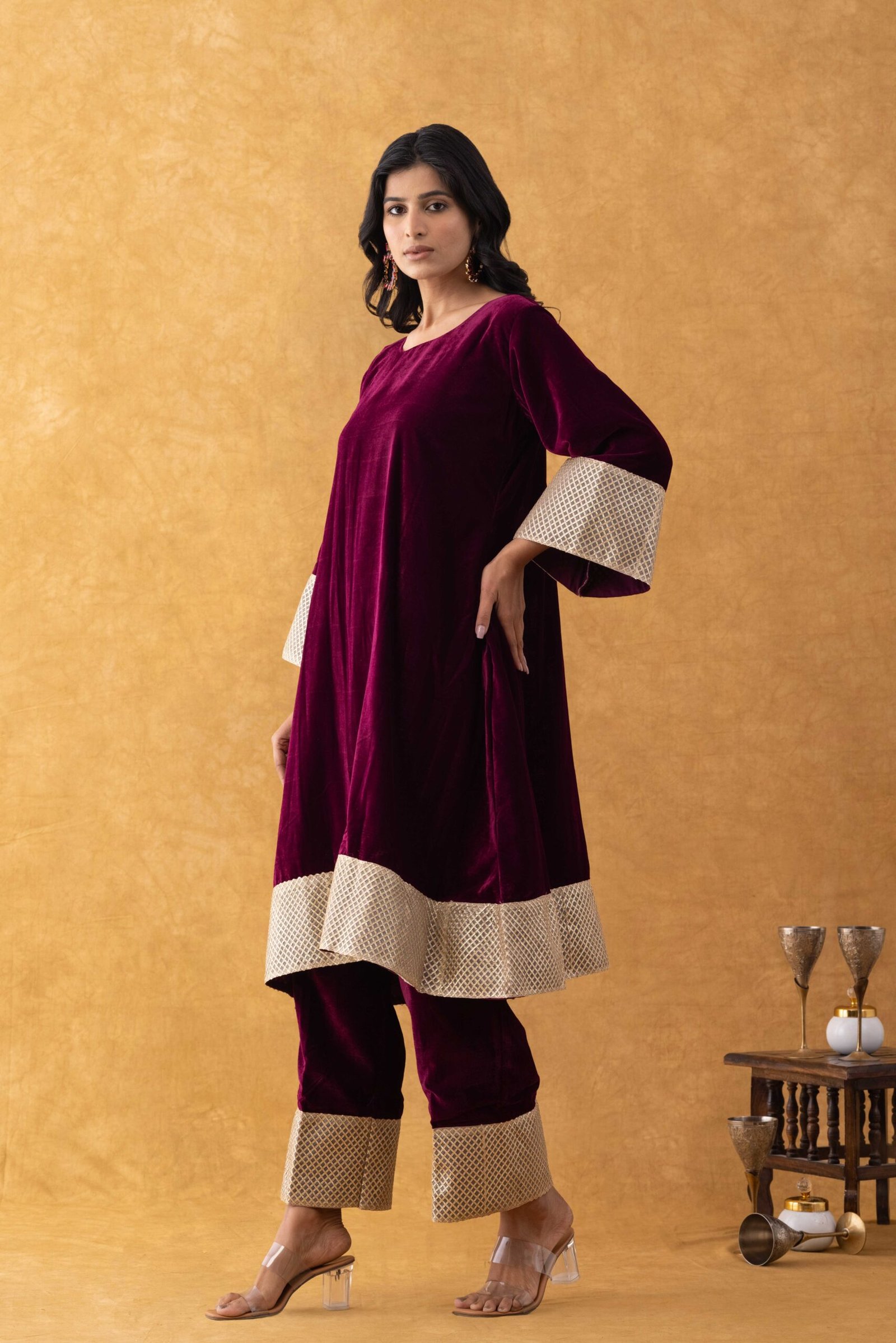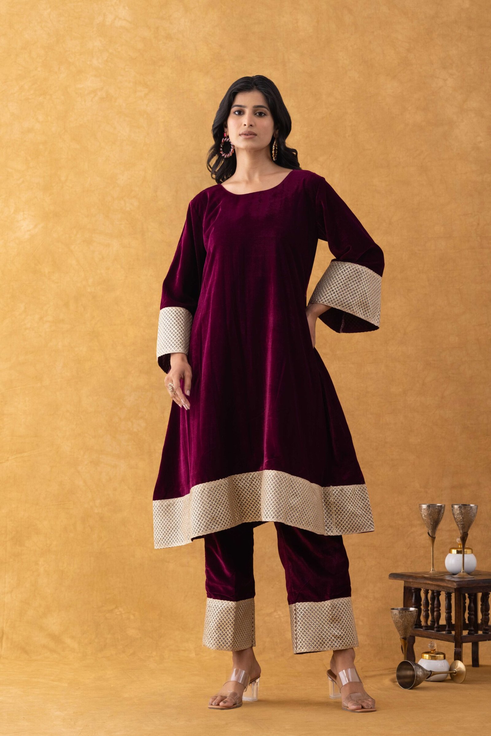 Refined, elegant, and timeless — the RANGPUR Burgundy Velvet Kurta Pant Set is crafted for women who appreciate understated luxury. Made in rich velvet fabric, the kurta features a relaxed silhouette enhanced with woven gold border detailing on the sleeves and hem, adding a regal festive touch without overpowering the look.