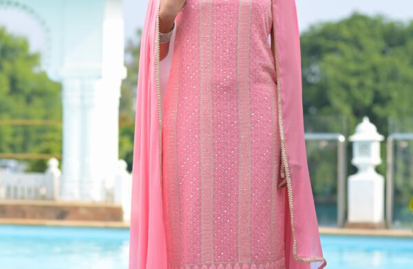 Light pink embroidered chikankari straight kurta set . It has square neck and comeswith cotton afghani salwar and dupatta