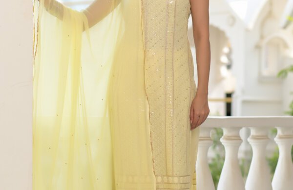 yellow embroidered chikankari suit set. It has a square neck and comes along with yellow cotton afghani salwar and chiffon…